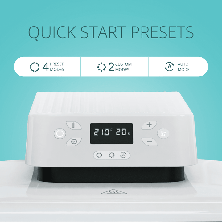 Wählen Sie aus vier Voreinstellungen (HTV, Glitter-HTV, Transferpapier, Sublimationspapier), zwei benutzerdefinierten Voreinstellungen und einem Automatikmodus für die Serienproduktion, um die Effizienz und Benutzerfreundlichkeit zu verbessern. Oder stellen Sie Ihre eigene Temperatur und gewünschte Heizzeit ein.