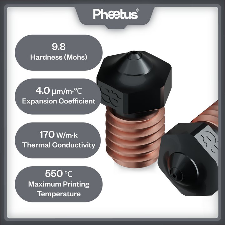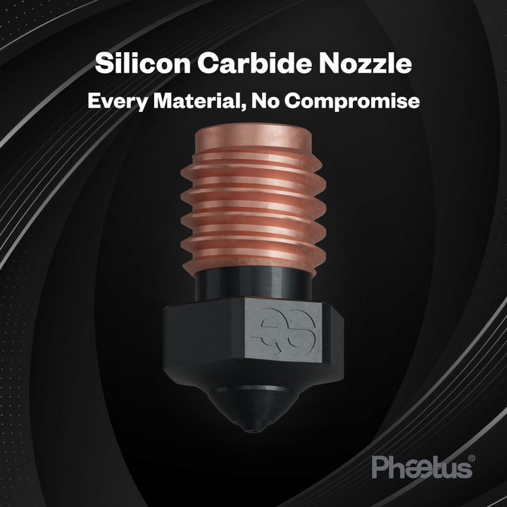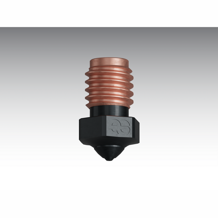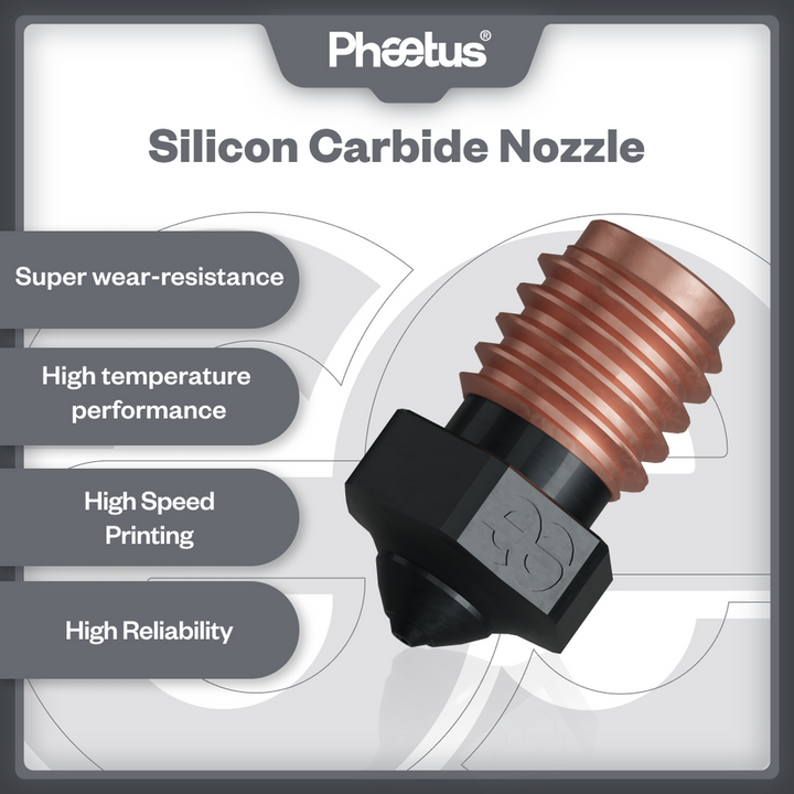 Die Silicon Carbide Düse erfüllt alle Druckanforderungen, egal ob Sie mit normalem PLA, PEEK oder sogar mit kohlenstofffaserverstärkten Materialien arbeiten. Hergestellt aus 99,9% hochreinem Siliziumkarbid, bietet die Düse eine hohe Temperaturbeständigkeit und außergewöhnliche Verschleißfestigkeit. Dies gewährleistet eine lange Lebensdauer von bis zu 550 Druckstunden, ohne dass es zu Abnutzungen an der Düsenöffnung oder der Düsenspitze kommt.