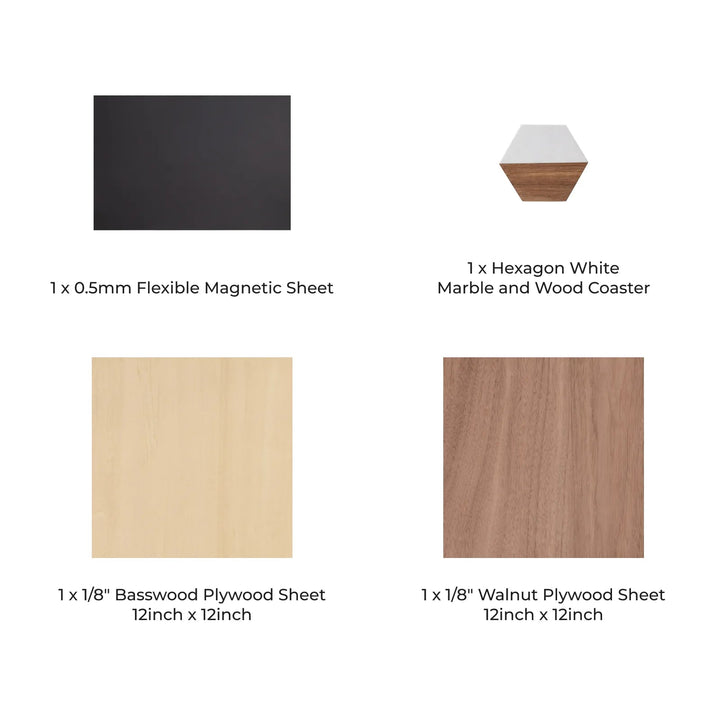 - 2 Furnierplatten (Basswood & Walnuss), je ca. 305 × 305 mm, 3 mm dick